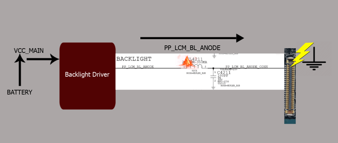 For phone A, we checked the diode mode reading at the screen connector pin 33 for PP_LCM_BL_ANODE_CONN. The normal value of the backlight line, PP_LCM_BL_ANODE, is around 500 (diode mode units-DMU). Our multimeter reading was very high at 1.8 DMU. This tells us that there is open line fault somewhere on the line. The common fault is a failure of the backlight filter, FL4211. A brief look at the schematic shows us that if the battery is not disconnected, then live battery voltage will always be present at the backlight pin--even if the device is powered off! Any transient short to ground during the screen connection process will instantly create a path for electricity to rush through, unregulated. This burst of current will overheat the backlight filter, FL4211, and damage it. Indeed, that was the case with Phone A. We replaced the backlight filter and measured the relative resistance of the line in diode mode---back to normal. So that tells us that the problem in Phone A was indeed technician damage due to performing a screen replacement without disconnecting the battery.