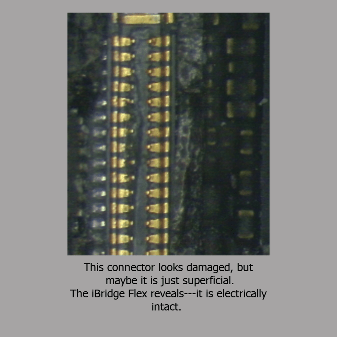 After replacing the backlight filter, it was time to test. But what about the connector on the board--it LOOKS pretty mangled--but is it functional? If possible, we'd like to save David the extra cost of an add-on connector job if we can. This is where the iBridgereally shines. By connecting the iBridge into the damaged connector, we could measure THROUGH the connector. We found that despite the damage, this connector has normal relative resistance on all lines and indeed was functional. Phone A got a new screen installed and booted up working.