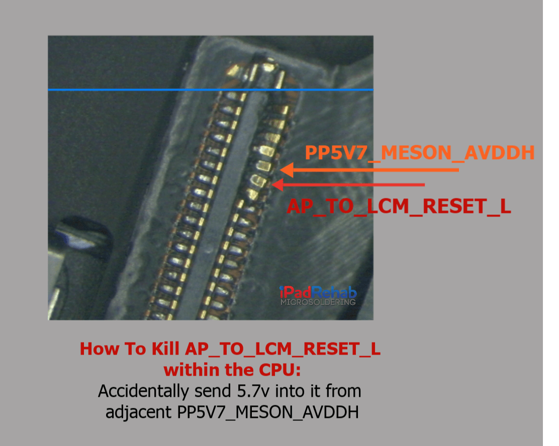 With the image reset line short, it is held in the low position permanently. For those of you like me in your forties, this is like trying to play your old Atari 2600 with your friend's finger holding down the reset button. The CPU believes the screen is in reset, and therefore does not send signals to chestnut to compel it to generate image power outputs. Hence, PP5V7_LCM_AVDDH and PP5V7_MESON_AVDDH lines were 0v.