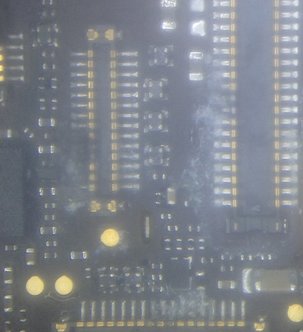 This is typical iPhone 5 corrosion at LCD connector. This phone will not show a backlight. The corrosion was very focal--just here at the backlight, digitizer and front camera connector