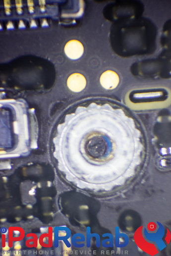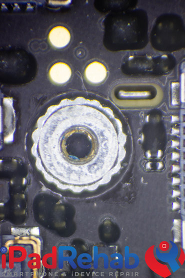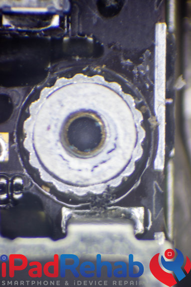 Making a connection to the recent BSOD problem on the iPhone 5S, I took a hard look inside the screw brackets. In a normal phone, the bottom of the screw bracket is nothing but the clean black coating of the solder mask applied to all non-conductive surfaces of the board. Sometimes you can see blue plastic along the edges of the screw bracket from the plastic coating on the shaft of the screws.